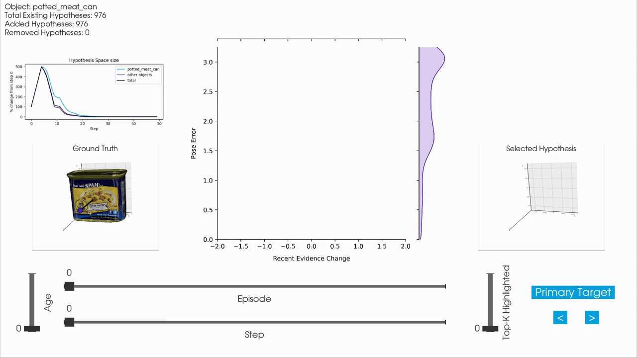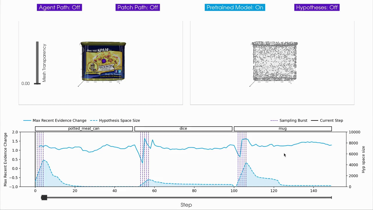 Since Monty is a sensorimotor framework, everything happens as a timeseries of sensing and acting. Therefor, many aspects of the experiment are better visualized as an animation that can show how hypotheses evolve over time. We have a couple of functions to create animations in the plot_utils.py file. Below is one example how this could be applied to data loaded with the code above.