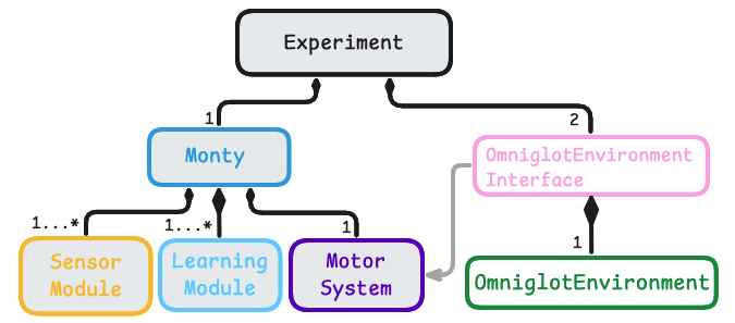 The diagram below shows the base abstract classes in Monty. For general information on how to customize those classes, see our guide on Customizing Monty. The Experiment class coordinates the experiment (learning and evaluation). It initializes and controls Monty and the environment and coordinates the interaction between them. The EmbodiedEnvironment class is wrapped in an EnvironmentInterface subclass, which exposes methods to interact with the environment. An experiment can have two environment interfaces associated with it: one for training and one for evaluation.